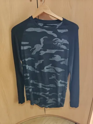 Camiseta de manga larga con estampado de camuflaje. - Diseño de camuflaje en tonos negros y grises. - Mangas de color negro liso. - Logo de la marca en el pecho.