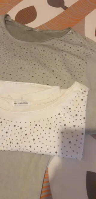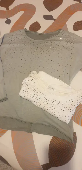 Pack de dos camisetas de manga larga para mujer, adornadas con pequeños brillantitos. Talla L. - Camiseta gris con brillantitos. - Camiseta blanca con brillantitos.