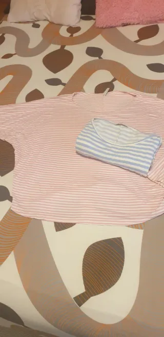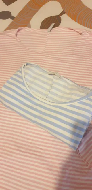 Pack de dos camisetas de mujer con estampado de rayas. Una es de color rosa y la otra es azul y blanca. - Camiseta de rayas rosas.( pequeña mancha que no se va, esta x dentro) - Camiseta de rayas azules y blancas.