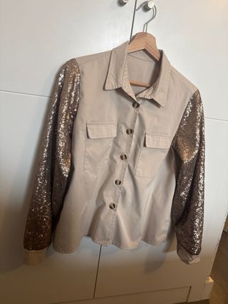 Sobrecamisa con un diseño moderno y llamativo. - Mangas largas adornadas con lentejuelas doradas. - Cuerpo de la sobrecamisa en color beige. - Cierre frontal con botones. - Dos bolsillos en el pecho.