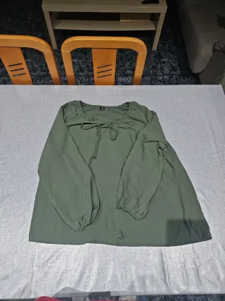 Camisa de manga larga en tono verde oliva. Presenta un diseño con cuello y cordones. - Manga larga abullonada con puño elástico. - Cuello con cordones para ajustar. - Tejido ligero y fluido.