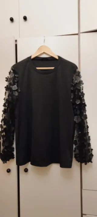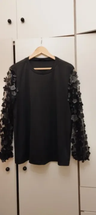 Elegante camiseta negra con un diseño especial en las mangas. - Mangas largas de tejido transparente con bordado floral. - Corte peplum en la cintura.