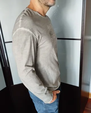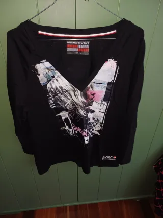 Camiseta de manga larga con un diseño brillante y llamativo. Tejido con acabado metalizado. Cuello redondo. Talla única (equivale a una XL) Hecha en España Sin estrenar