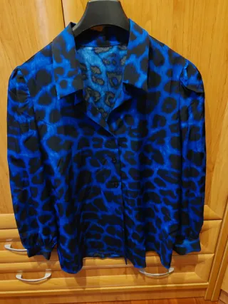 Camisa con estampado animal print en tonos azules y negros. Poco uso. - Cuello camisero. - Cierre de botones. - Mangas largas abullonadas.