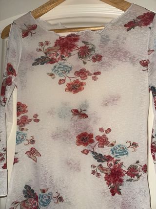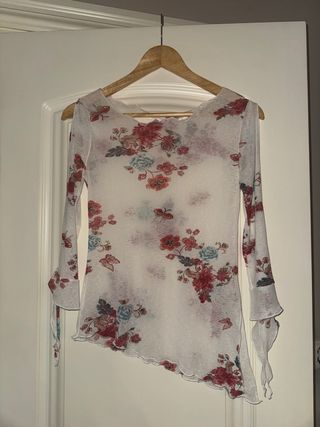 Camiseta de manga larga con un estampado floral vibrante sobre un fondo blanco. Su diseño ligero la hace ideal para diversas ocasiones. - Mangas largas acampanadas. - Bajo asimétrico con acabado festoneado. - Tejido semitransparente.