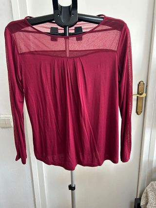 Camiseta manga larga granate mujer T. XL Camiseta de manga larga en color granate. Presenta un diseño con detalles de tejido transparente en la zona del escote y los hombros. Así como una franja a lo largo de la manga - Escote redondo. - Mangas largas. - Tejido ligero y fluido. Ancho de hombros: 44 Largo: 64 Sin bolas. Buena calidad Viscolastica y poliéster