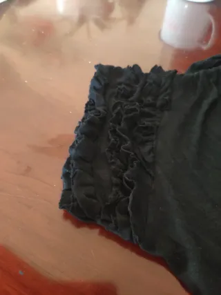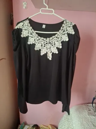 Camiseta negra de manga larga con detalles en encaje en el hombro. - Cuello en V. - Manga corta - Detalle de encaje en el hombro derecho.