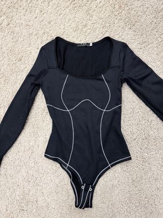 Body negro de manga larga con un diseño moderno. - Tejido acanalado. - Costuras decorativas en contraste. - Abertura para el pulgar en los puños.