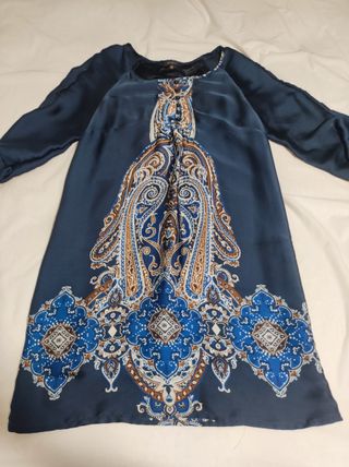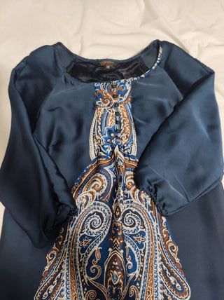 Camiseta larga con un diseño llamativo y elegante. - Mangas largas raglán. - Estampado paisley en tonos azules y marrones. - Cuello redondo. - Cierre de botones en la parte delantera.