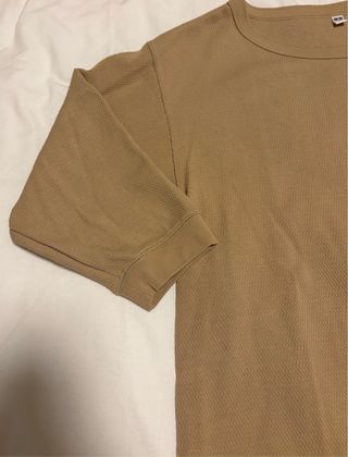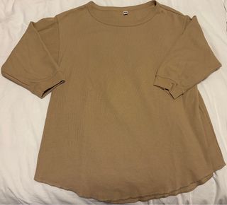 Camisa Uniqlo de manga tres cuartos en color marrón/camel. Bastante grande, mide 50 cms en los hombros y 68 cms de largo - Cuello redondo. - Mangas amplias con puño.