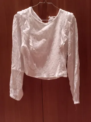 Blusa blanca de manga larga con detalles de volantes. Es del Pink Pomelo pero no está en la lista de marcas. - Tejido texturizado. - Cuello redondo. - Cierre en la espalda.