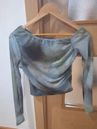 Camiseta de manga larga con un estampado abstracto en tonos verdes, azules, grises y marrones. El tejido es ligero y transparente, con un drapeado en el lateral. - Diseño de cuello desigual. - Mangas largas. - Tejido de malla.