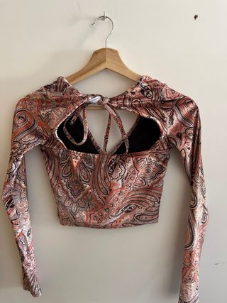 Top de manga larga con estampado a colores, escote en pico y espalda algo descubierta.