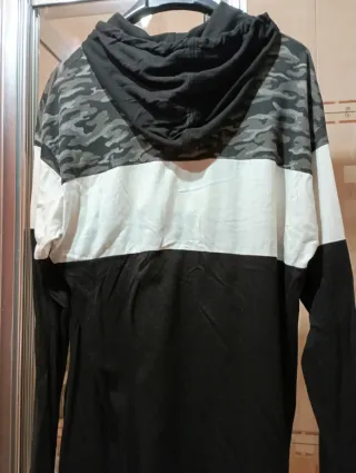 Camiseta con capucha y diseño moderno. - Estampado de camuflaje en la parte superior. - Banda blanca con texto RVLTNO1. - Mangas largas y cordones en la capucha.