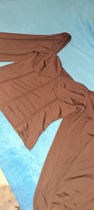 Camiseta marrón de manga larga con un diseño moderno. - Mangas abullonadas. - Escote cuadrado. - Detalle de fruncido en el torso. - Da la sensación que es un corsé ya que no es una camiseta larga y tiene esos detalles en el pecho y cintura