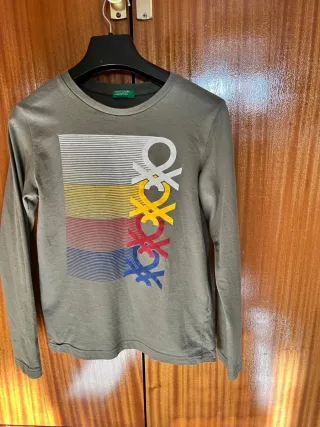 Camiseta de manga larga con un diseño gráfico llamativo en la parte delantera. - Estampado de líneas horizontales y el logo de Benetton en varios colores. - Cuello redondo. - Manga larga. - Muy buena calidad y como nueva