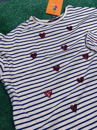 Camiseta de manga larga con un diseño de rayas azules y blancas. Presenta detalles de corazones rojos brillantes. - Diseño de rayas marineras. - Corazones rojos con lentejuelas. - Manga larga.