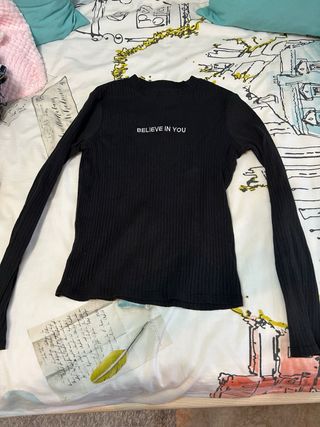 Camiseta negra de manga larga con un diseño sencillo y moderno. La frase Believe in you está estampada en la parte delantera. - Tejido acanalado. - Cuello redondo.