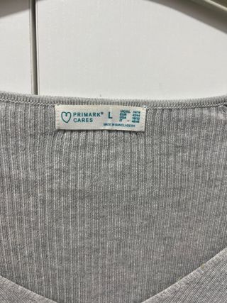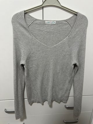 Camiseta de punto gris con cuello en V pronunciado. - Diseño de canalé. - Manga larga. - Bajo con acabado festoneado.