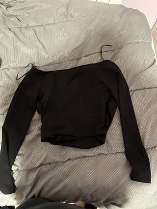 Elegante top negro de manga larga con un diseño drapeado. - Escote pronunciado. - Mangas largas. - Detalle fruncido en el lateral.