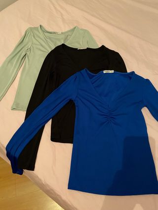 Conjunto de tres camisetas de manga larga con cuello en V. Dan poca talla S/M - Camiseta verde menta. - Camiseta negra. - Camiseta azul eléctrico. 12€ las tres.