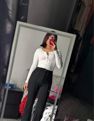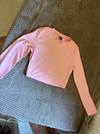 Camiseta corta de manga larga de Zara. - Diseño ajustado. - Cuello redondo. - Tejido suave y elástico.