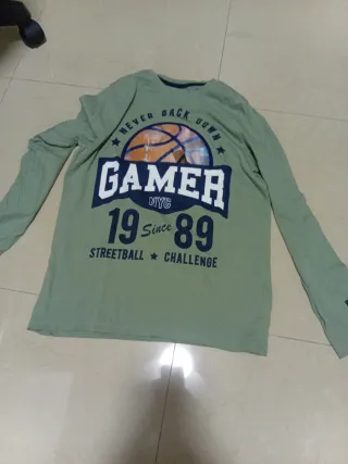 Camiseta de manga larga con diseño Gamer y temática de baloncesto. - Estampado frontal con Never Back Down y Streetball Challenge. - Detalle de NYC y 19 Since 89 en la parte delantera. - Diseño inspirado en el mundo gamer y el deporte.