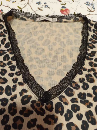 Camiseta de manga larga con un llamativo estampado animal. - Cuello en pico con detalle de encaje negro. - Tejido cómodo y ligero.