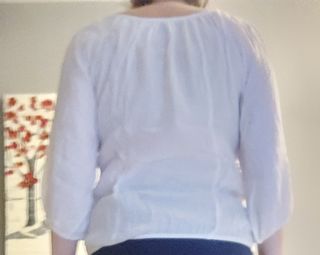 Blusa blanca de Zara con manga 3/4. - Medidas: Largo 55 cm Pecho 110 cm contorno - Diseño con detalles de puntadas alredddor del cuello. - Escote cuadrado. - Banda vertical de pliegues en la parte delantera. - Mangas abullonadas con elástico en los puños. - Elastico en la cintura - 100% algodon