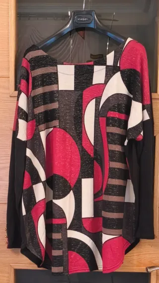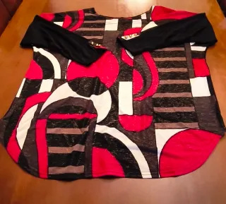 Camiseta de mujer con un llamativo estampado geométrico y abstracto. - Diseño multicolor con detalles en rojo, blanco, negro y marrón. - Mangas largas. - Tejido con brillo sutil.