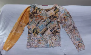Camiseta de manga larga con un diseño llamativo y colorido. - Mangas largas. - Cuello en V. - Estampado artístico.