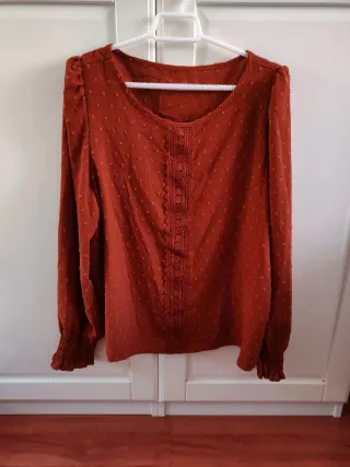 Talla L. Marca shein Camisa de manga larga con un diseño texturizado y detalles de encaje en la parte frontal. El cuello es redondo y las mangas terminan en puño. - Tejido con pequeños relieves. - Adorno de encaje central. - Puños elásticos. .