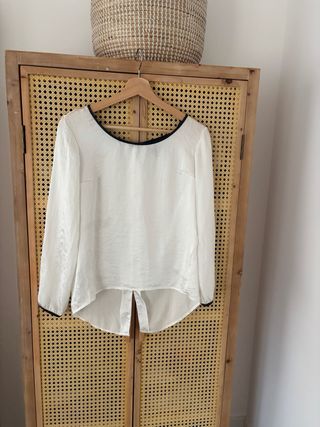 Tejido tipo raso. Color blanca con detalles en negro. De Bershka. Talla S. Medidas: largo: 56cm por delante y 60cm por detrás. Largo manga: 48cm. Distancia entre sisas: 43cm. Perfecto estado.