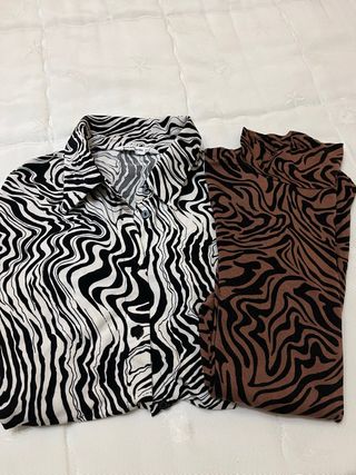 Conjunto de dos camisetas con un llamativo estampado de cebra. - Una camiseta es de manga larga y cuello alto. - La otra camiseta es de manga larga y cuello camisero.