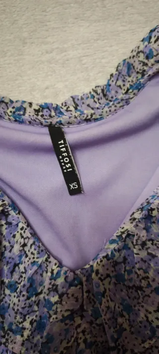Blusa estampada con flores en tonos morados y azules. Presenta un diseño con volantes en el escote y mangas largas abullonadas. - Tejido ligero y vaporoso. - Corte cropped. - Escote en V con detalle de volantes. Talla XS amplia, vale por una S. En buen estado.