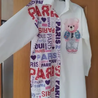 Camisa larga con estampado de PARIS y un divertido oso. - Diseño asimétrico con estampado de PARIS en un lado. - Detalle de un oso con chaqueta y pantalones en el otro lado. - Mangas largas.