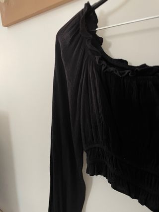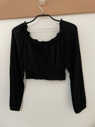 Blusa corta de manga larga con un diseño moderno y favorecedor. - Escote elástico con volantes. - Cintura fruncida. - Tejido ligero y con textura.
