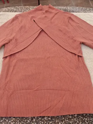 Blusa de punto en talla 3XL. Nueva,aunque no tiene etiquetas nunca se ha usado. Original diseño con cuello alto por la parte de atrás que continua, en forma de tiras cruzadas, por el delantero y termina en las costuras. Al ser de canalé cede 5-6 cm de las medidas, éstas son: Hombro 39 cm; Sisa 47 cm; Largo 62 cm; Largo manga 56 cm