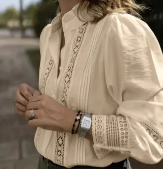 Elegante blusa de mujer con detalles de encaje. - Cuello alto con volantes. - Mangas largas abullonadas. - Cierre de botones. - Adornos de encaje en el frente y puños. Me costó 12€