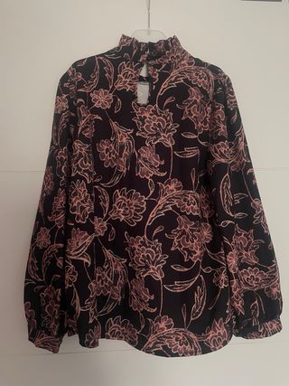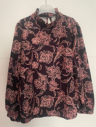 Blusa elegante con estampado floral. - Diseño de manga larga. - Cuello alto con detalle fruncido. - Cierre en la nuca con botón. - Nueva solo le falta la etiqueta, nunca usada.