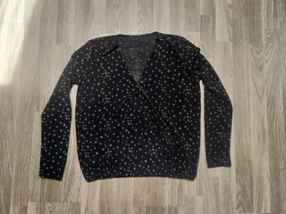 Blusa con cuello de pico, diseño cruzado y estampado de estrellas. Las mangas y la parte de atrás son transparentes, mientras que la parte de delante lleva forro. Tiene goma en la cintura para ajustar. Medidas: 52 cm de ancho, 56 cm de largo.