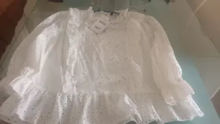 Bonita blusa de Zara con detalles calados y volantes. - Diseño con cuello alto y mangas largas abullonadas. - Acabado con volantes en el bajo y en los puños. - Tejido ligero y vaporoso.