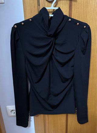 Elegante blusa negra de la marca Minueto, con un diseño sofisticado y detalles que marcan la diferencia. - Cuello alto drapeado. - Hombros con botones dorados decorativos. - Mangas largas abullonadas. - Detalle de fruncido en el delantero. - Puños con botones dorados.