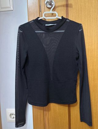 Camiseta de manga larga con un diseño transparente y detalles brillantes. - Cuello alto. - Mangas transparentes. - Panel frontal con transparencia en forma de V.