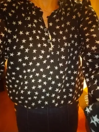 Blusa con estampado de estrellas. - Diseño con cuello - Manga larga - Cierre de botones Da talla, tiene volantes en cuello y puños, estilo romántico. Tiene forro en el cuerpo y las mangas son semitransparentes. Botones por delante y puños.