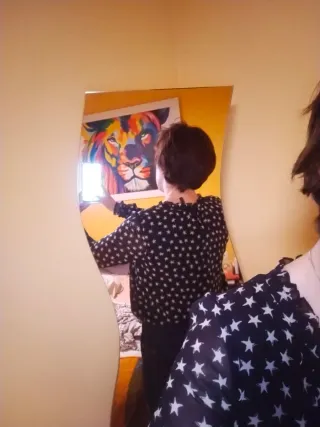 Camiseta de manga larga con un diseño frontal llamativo. - Estampado de rostro femenino con pañuelo floral. - Detalle de flores en tonos pastel y tierra. - Cuello redondo. Poco usada, muy fácil de combinar, tiene trabillas para recoger las mangas, tiene una imagen femenina y unos apliques de tela tipo collage.