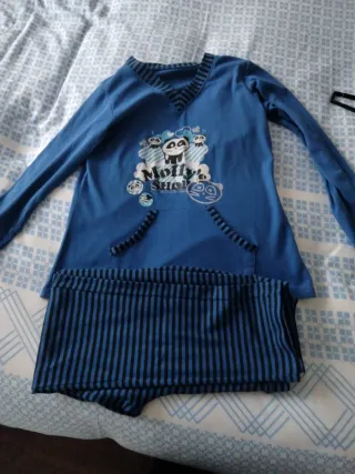Conjunto de pijama con estampado de pandas. - Camiseta de manga larga azul con dibujo. - Pantalón largo a rayas azules y negras.
