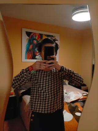 Blusa con estampado de pata de gallo. - Diseño de manga larga. - Cuello redondo. Amplia con cuello redondo, es corta por delante y más larga por detrás, tiene remaches en los hombros, tela que da caída