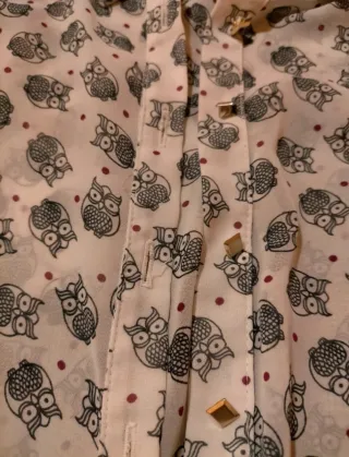 Blusa de manga larga con un bonito estampado de búhos en tonos grises sobre fondo blanco. El cuello es camisero y tiene botones en la parte delantera. - Diseño de búhos. - Cuello camisero. - Cierre de botones. En perfecto estado, blanca con búhos y topos rojos, muy fina, algo transparente. No necesita plancha