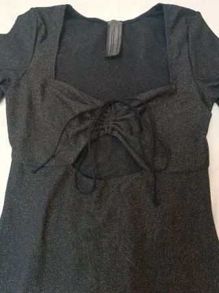 Camisa negra con pedrería en los hombros de la parte frontal y espalda. Muy bonita. Un solo uso.